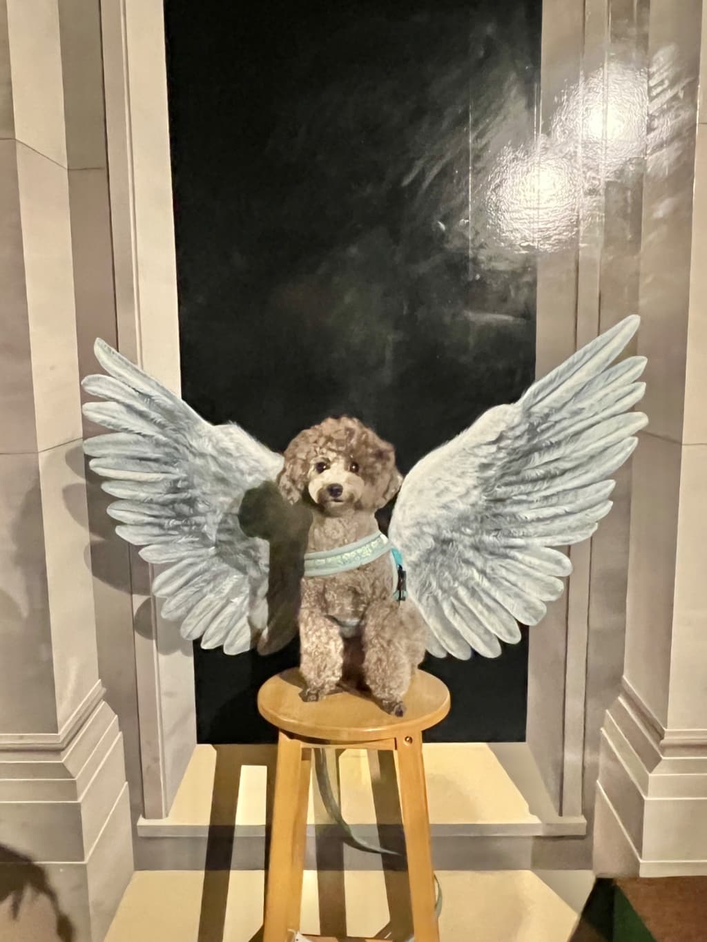 夏休みの繁忙期で、雨の日だったので、雨に当たらない子供の遊び場は少ないため、とても混雑していました。ワンコはほぼ抱っこして、写真撮影のときだけ下ろしてました。歩かせてもOKです。