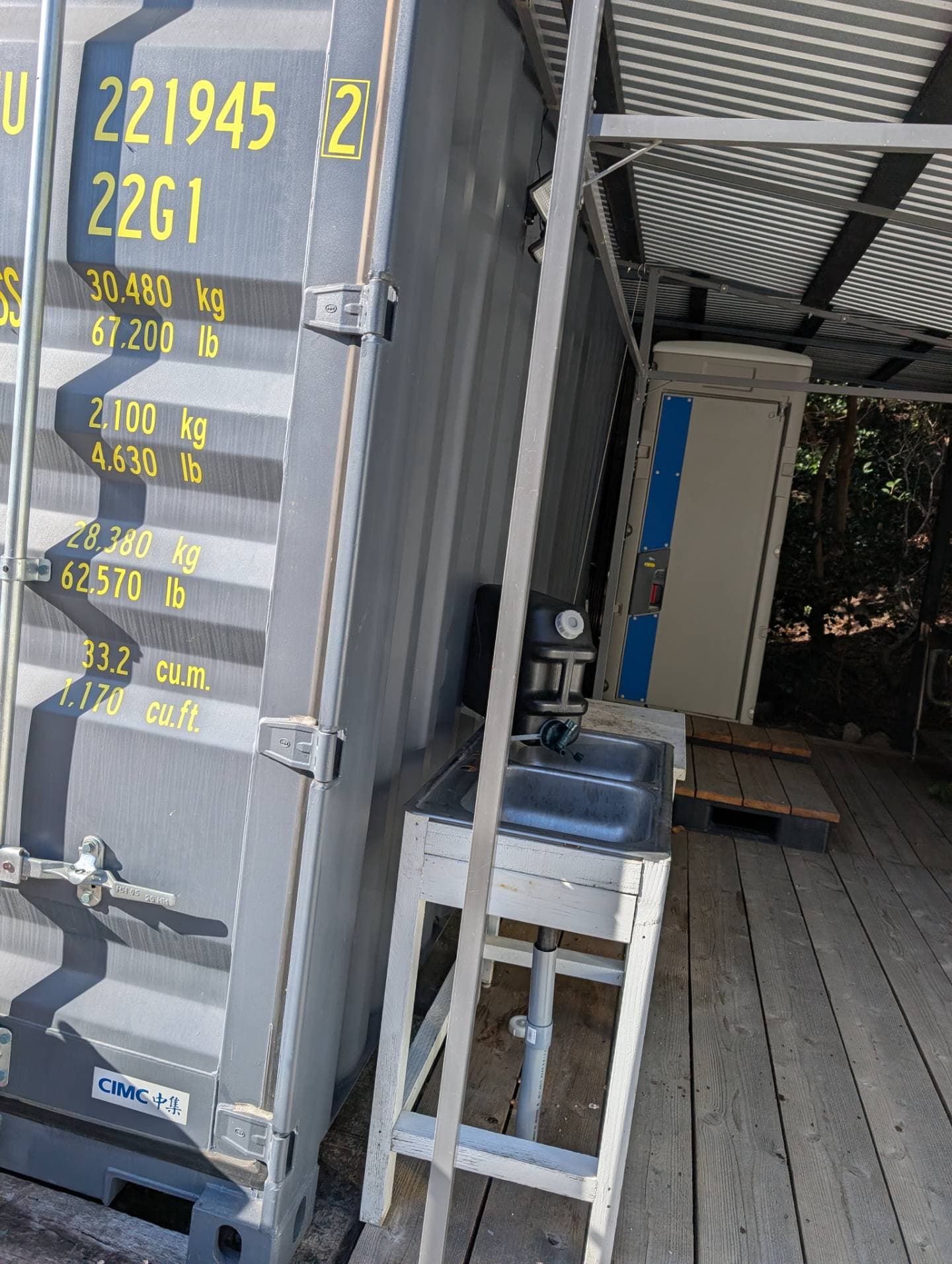 コンテナが2つ、間に屋根付きのリビングスペースがあり雨天でもタープなど用意しなくても良いのがいいところです。