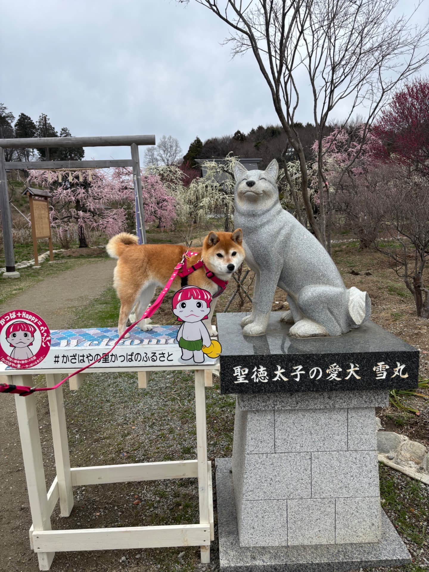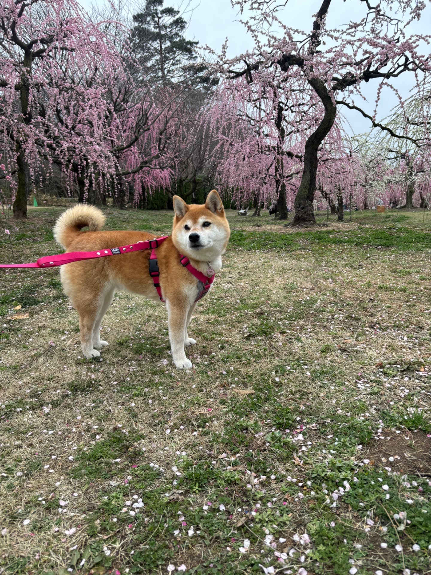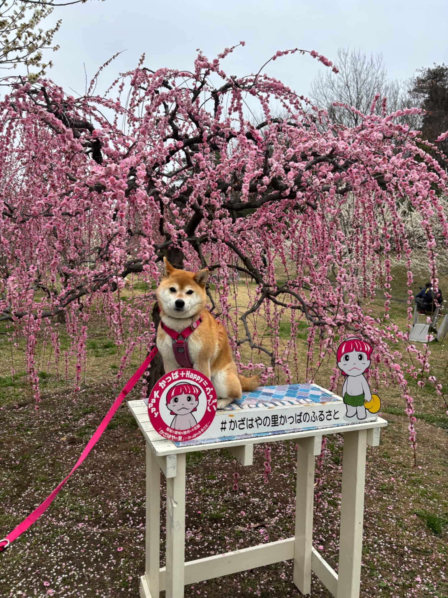 普通なら梅の木とワンちゃんって高さの差があるので撮りにくいですが、こちらの梅は枝垂れ桜が多いので、いい写真がたくさん撮れます。