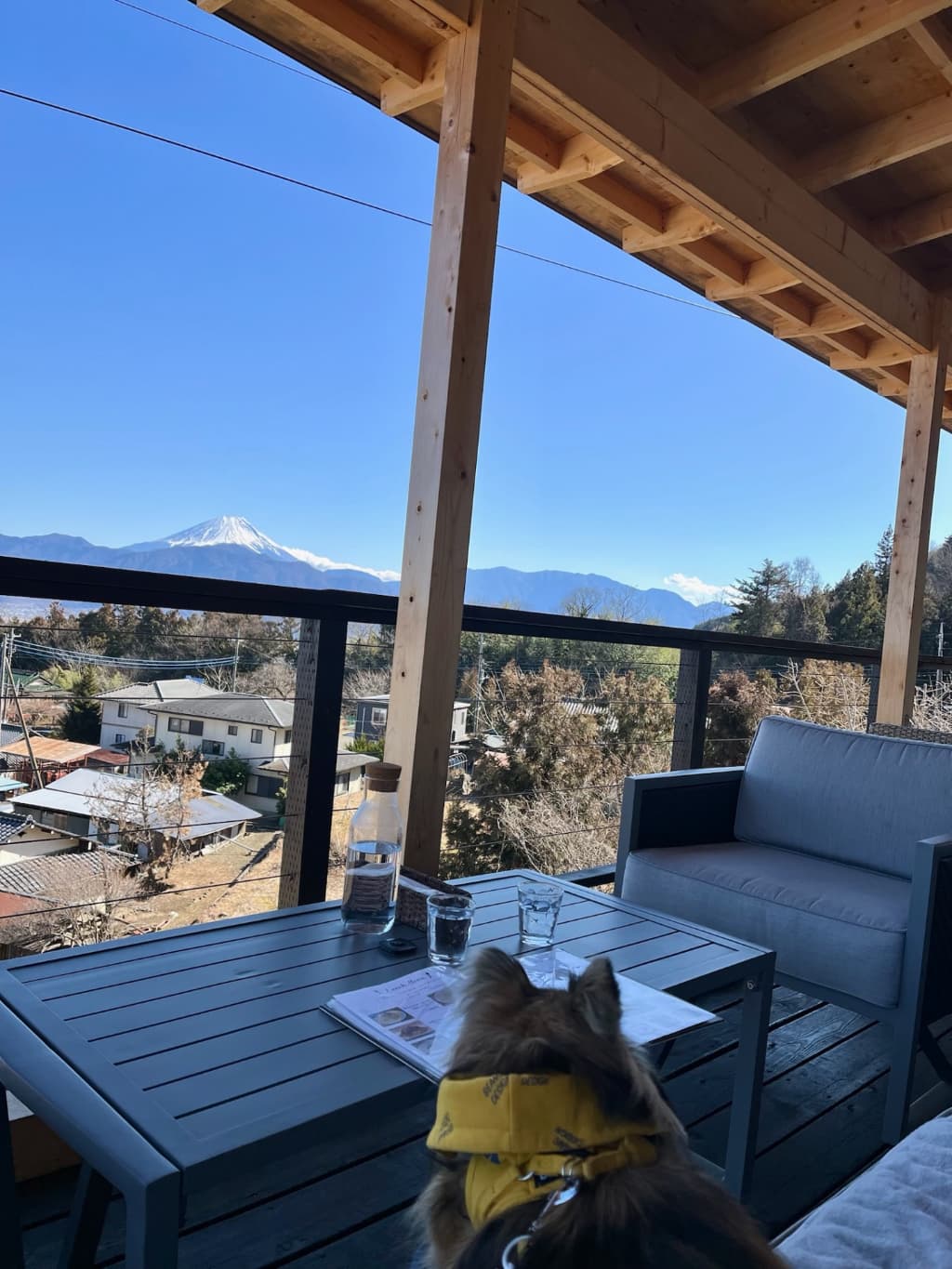 テラス席わんこ可!目の前に広がる富士山と甲府盆地の眺め、見た目もお味も素晴らしいメニュー。ランチに付いているスープとサラダも美味しいです。おそとのてらす併設のカフェ。宿泊しなくても利用できます。