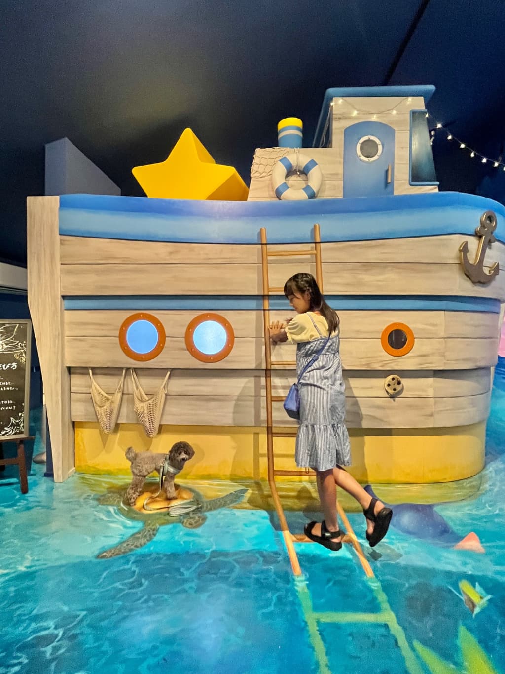 夏休みの繁忙期で、雨の日だったので、雨に当たらない子供の遊び場は少ないため、とても混雑していました。ワンコはほぼ抱っこして、写真撮影のときだけ下ろしてました。歩かせてもOKです。