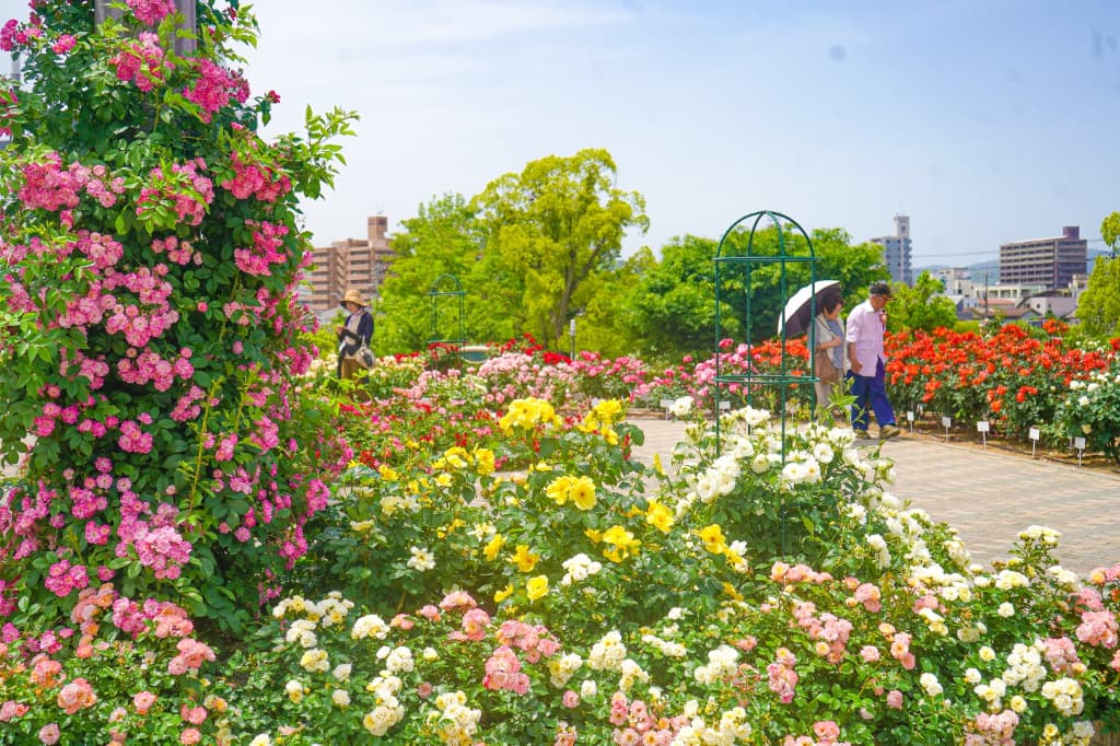 福山市の花である「バラ」のピラミッド型の花壇が公園の一番の見どころ。花壇の他には複合遊具のあるエリアや芝生広場があり、のんびりと美しいばらを眺めながら散策を楽しむのもおすすめです。