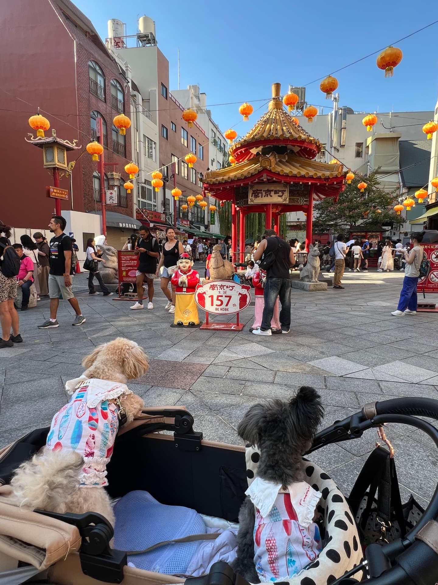 南京町。中華街の中心。座って食べてる人も沢山います。人形に吠えました。わんちゃん連れも沢山います。食べ歩きにピッタリです。
