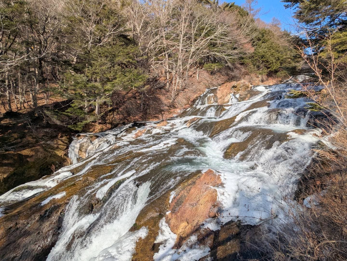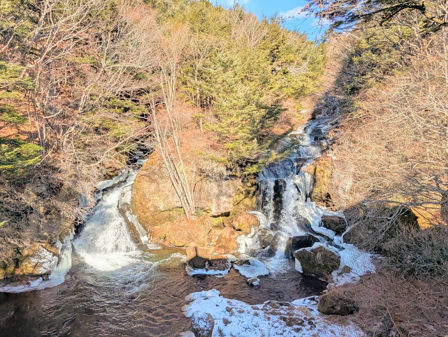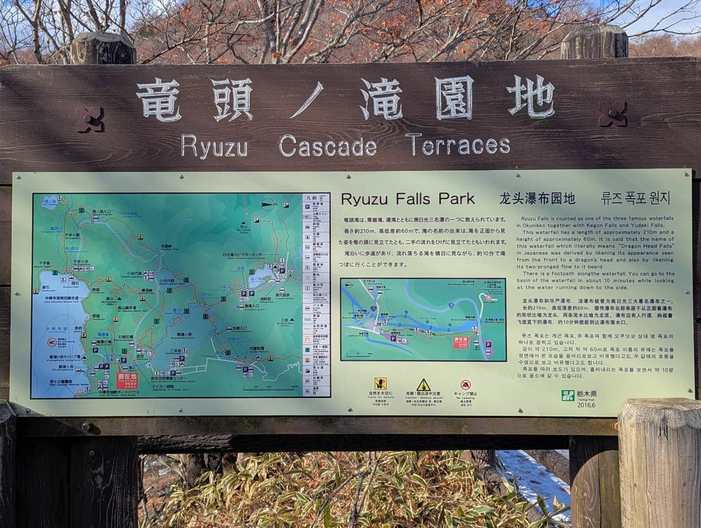 竜頭の滝は奥日光三名瀑の一つで、階段状の岩を流れ落ちる滝と、二つに分かれた滝壺が龍のようだと言われています🐉