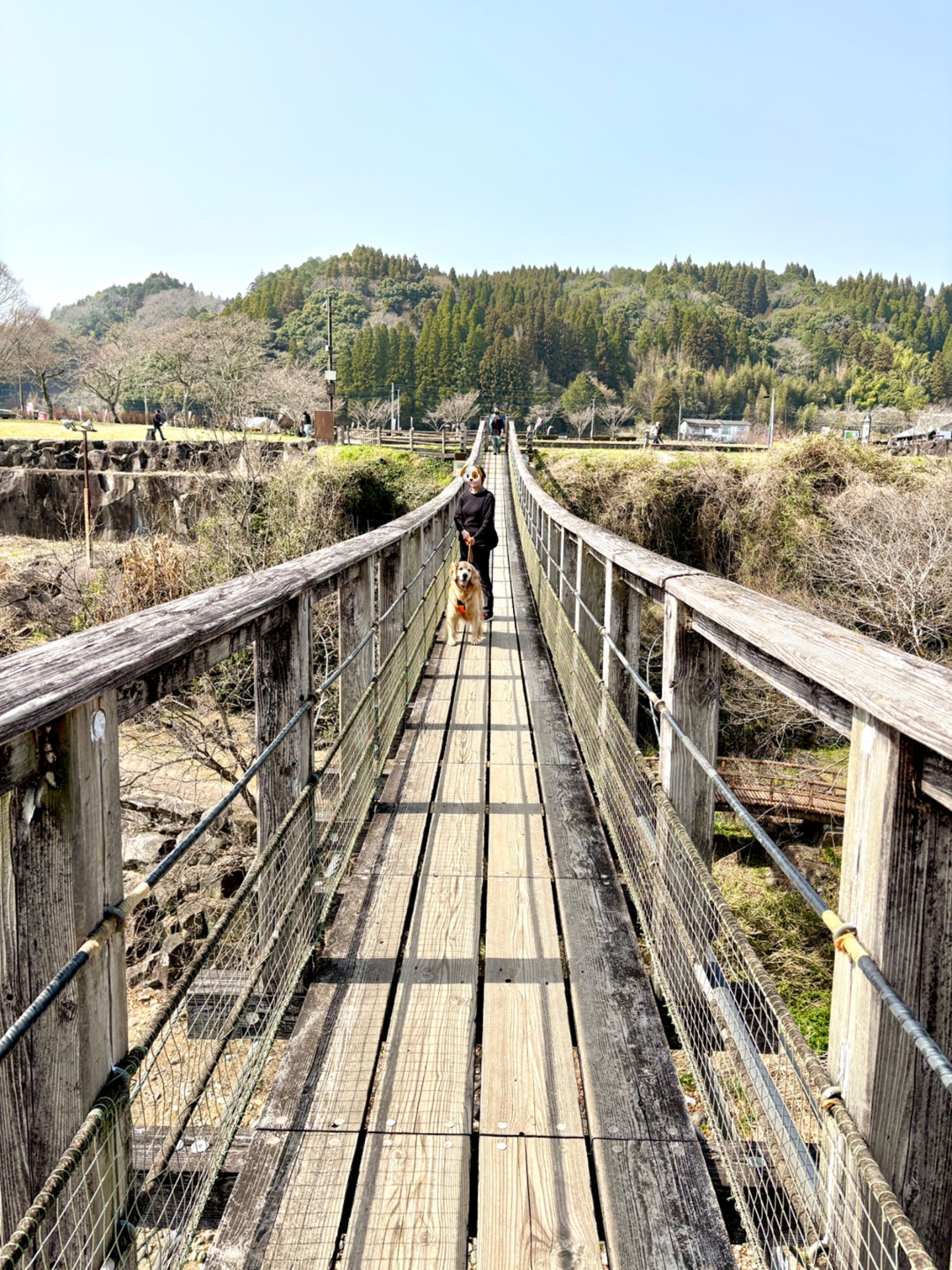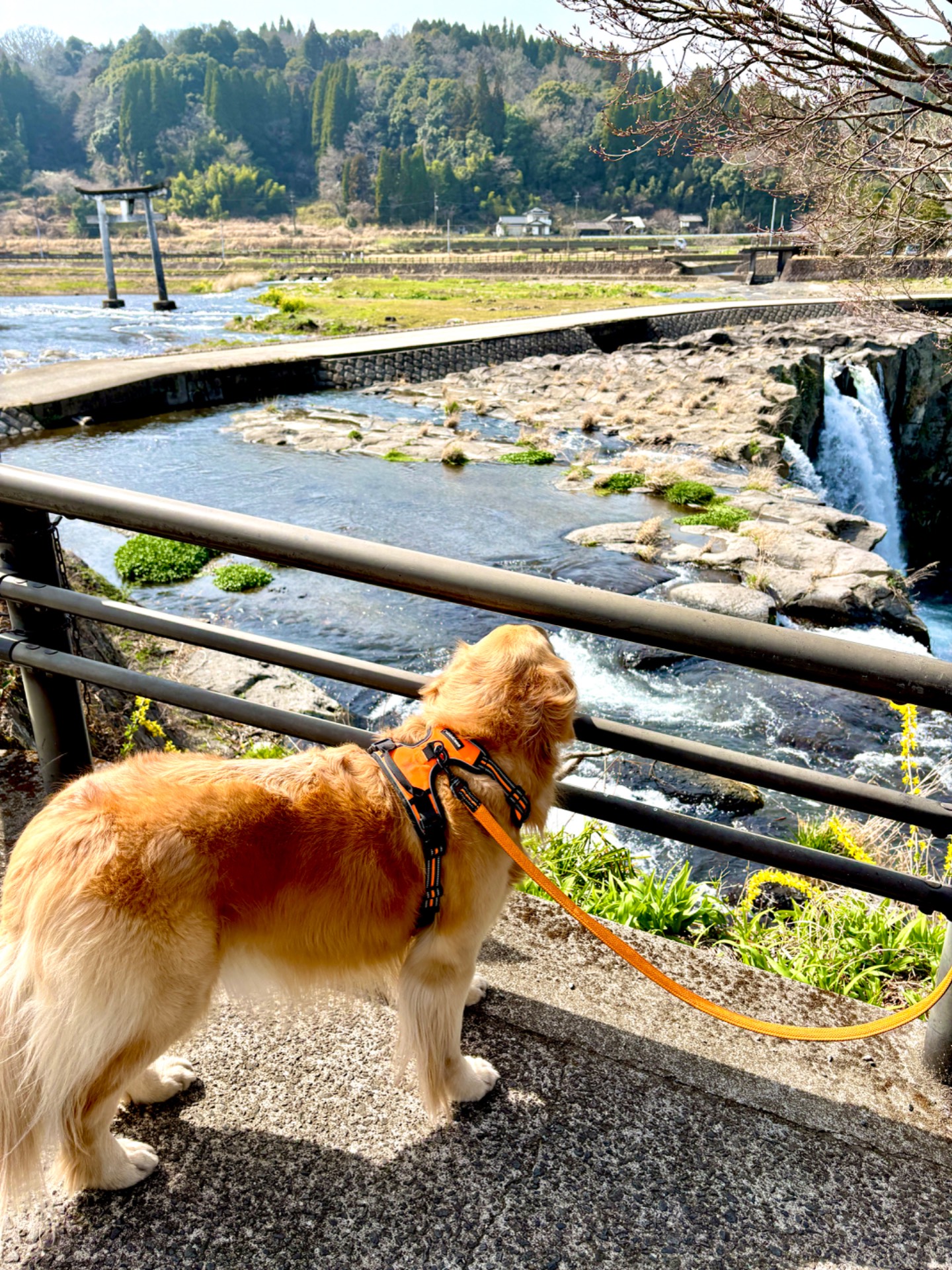 幅120メートル、高さ20メートルの雄大な平地にある見事な滝です。吊り橋「滝見橋」を渡り滝の周りを一周することもでき、滝が落ちて行く流れも、落ちた滝壺の水際にも行くことができます。すぐ近くの「道の駅原尻の滝」は、滝が見えるテラス席でワンコ🆗です。