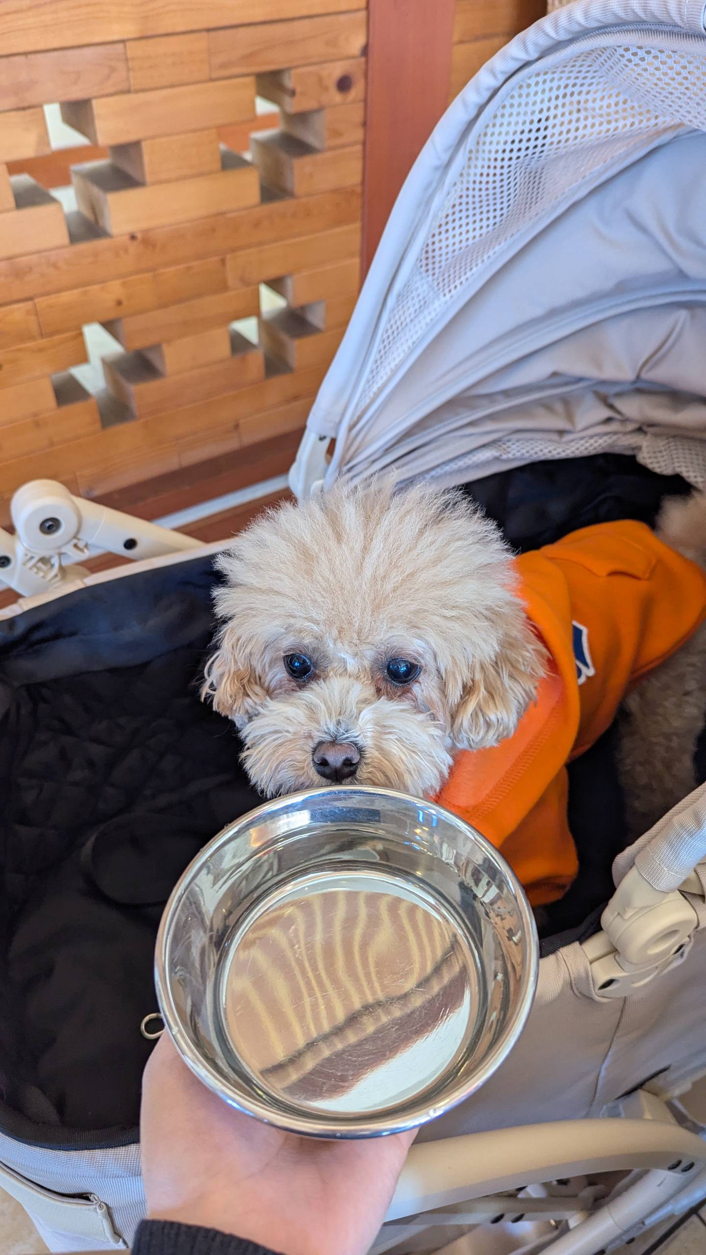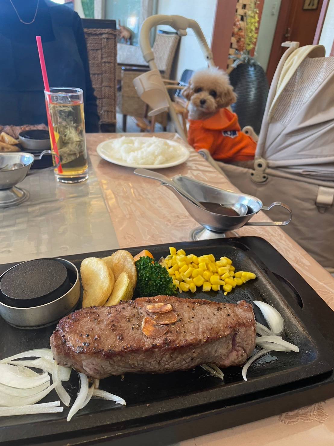 わんちゃんとステーキを食べられるお店は少ないのでありがたいです🥩が値段お高めの割に味は、、日曜日のお昼の時間でお客さんは他に1組でした。駐車場は広いです。わんちゃん連れの席の予約は承ってないとのことでした。6席くらいありました。わんちゃん用のお水は出してくれます。