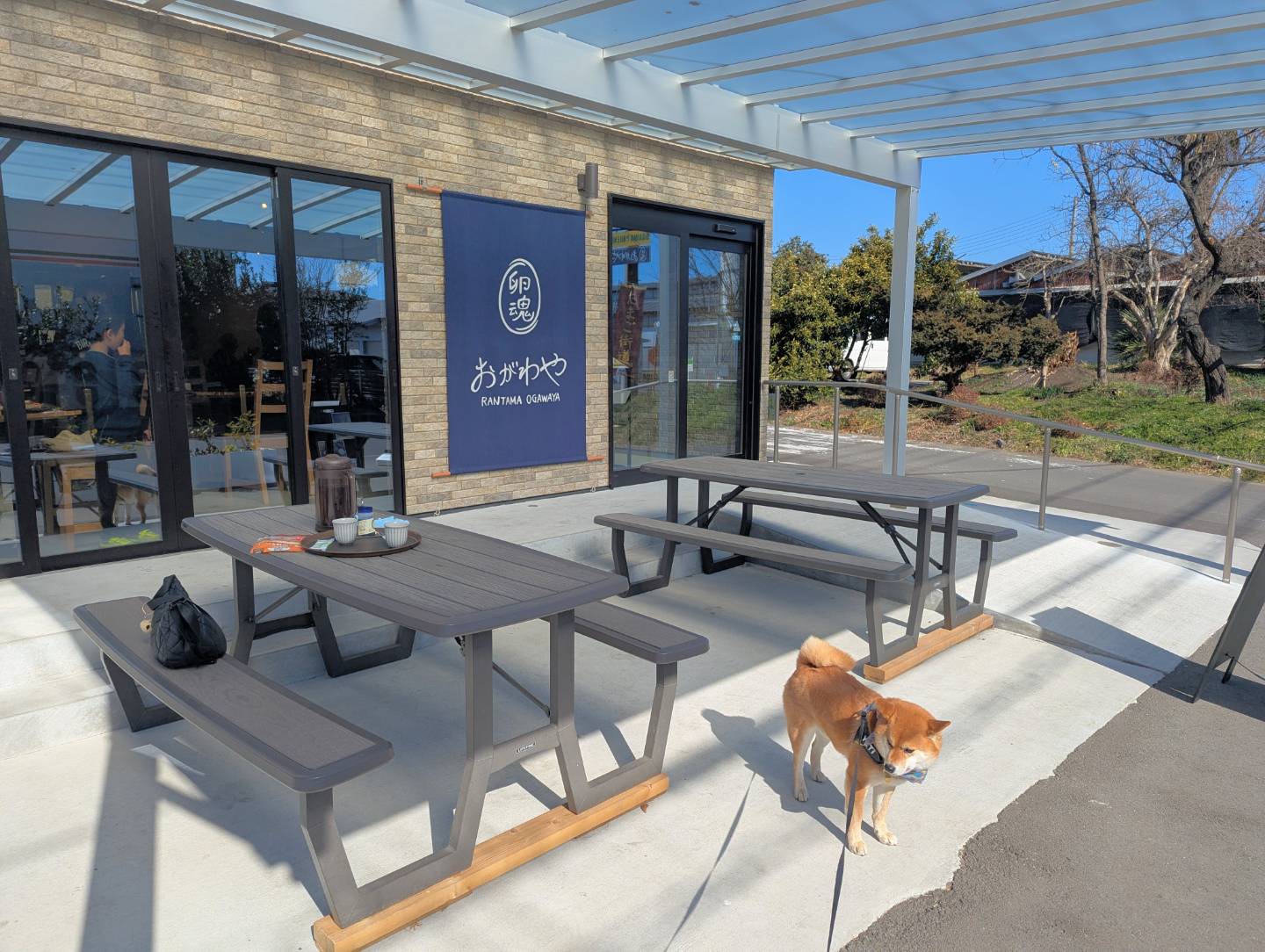 店舗前面にテラス席が4人がけのテーブルベンチ2脚があって、そこではワンちゃんと一緒に食事ができます🐶🆗